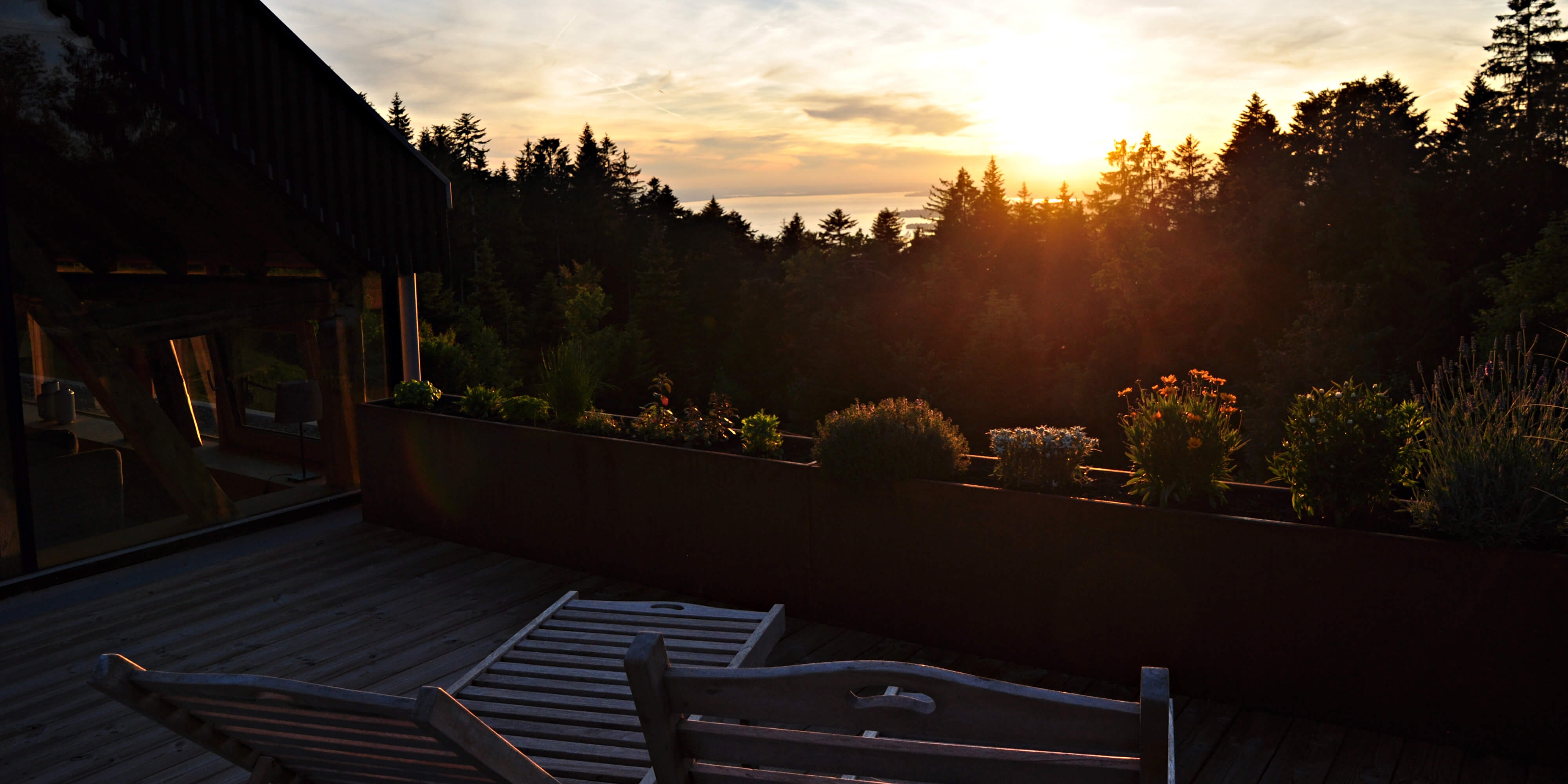 Ein separater Eingang führt Sie in die Ferienwohnung, in das 1. Obergeschoss. Holz ist unser liebstes Material, deshalb haben wir es oft und dennoch unaufdringlich eingesetzt. Eine großzügige, größtenteils umlaufende Verglasung mit einer großzügigen Terrasse, bietet einen atemberaubenden Blick auf den Bodensee. Der ständige Ausblick in die umliegende Natur mit Bewaldung und Bergwiesen, sorgt für eine wunderbare Atmosphäre und tiefe Entspannung.